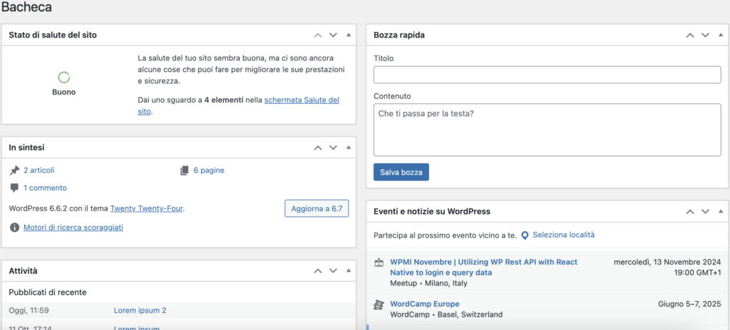 La bacheca di WordPress è la schermata principale dell’interfaccia di amministrazione di WordPress, dove puoi gestire il tuo sito web.