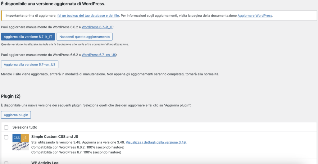 Gli aggiornamenti di WordPress sono essenziali per mantenere il sito sicuro, funzionante e dotato delle ultime funzionalità. Gli aggiornamenti possono riguardare il core di WordPress, i temi e i plugin installati.