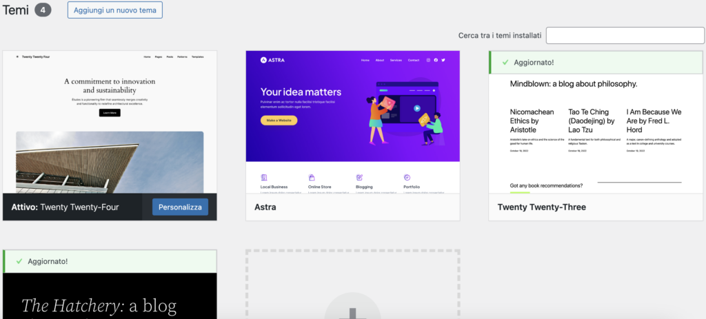 - In questa sezione puoi selezionare, installare e attivare i temi del sito. Un tema determina il design, lo stile e la struttura del sito.
