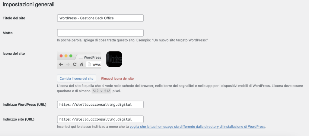 - Include impostazioni di base come il titolo del sito, il sottotitolo, l’indirizzo dell’URL del sito, la lingua, il fuso orario, il formato della data e dell’ora.